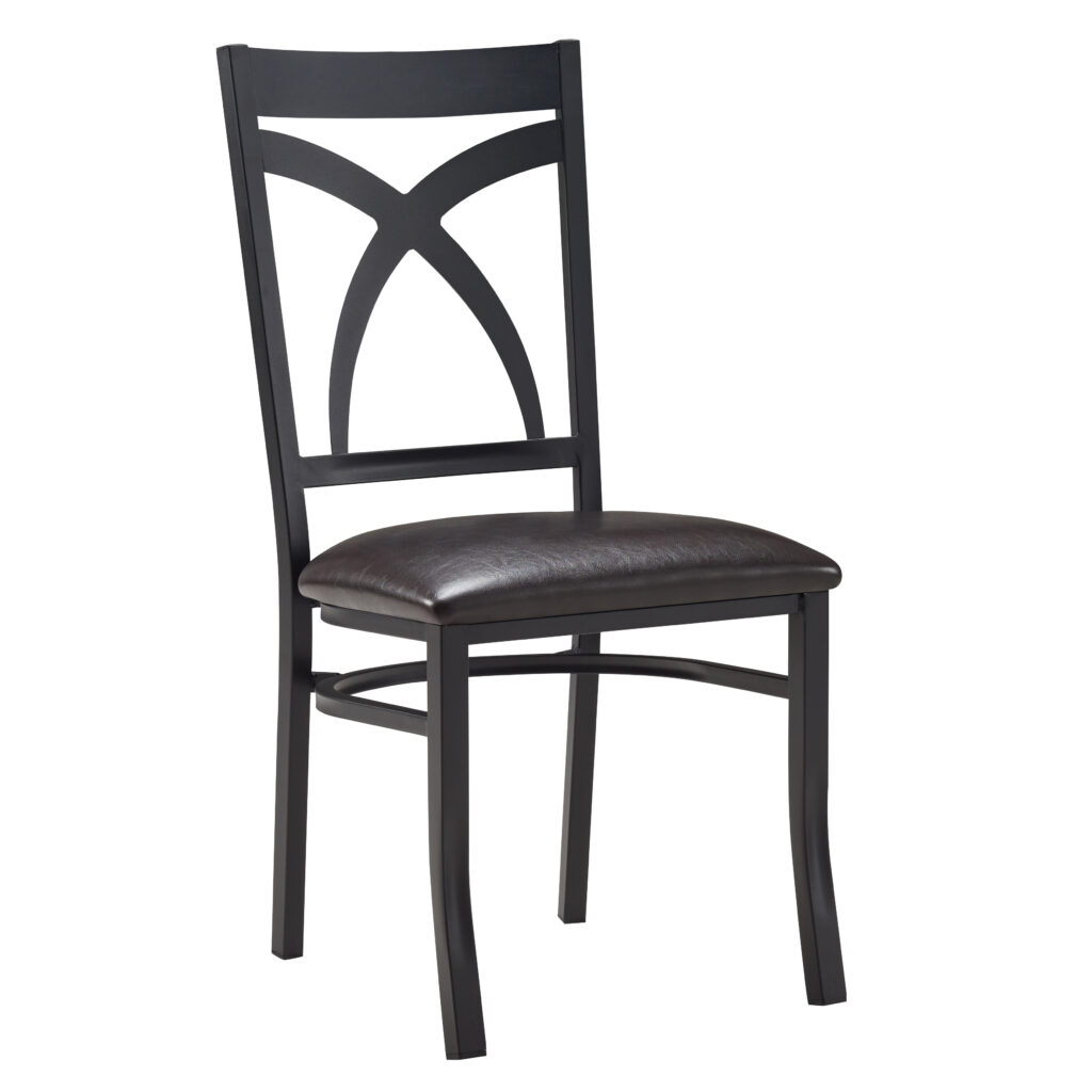 Designed for durability and comfort, the Drexel Dining Chair is a practical and stylish choice for group living spaces. Its sturdy, welded metal frame features a textured black finish, while the curved backrest with a crescent X-design adds a touch of classic charm. The seat is generously cushioned with plush foam and upholstered in easy-to-clean dark brown vinyl, providing a supportive and comfortable place to sit. With square legs reinforced by a circular metal brace for added stability, the Drexel is built for everyday use—and when space is limited, the stackable design offers smart, space-saving convenience.