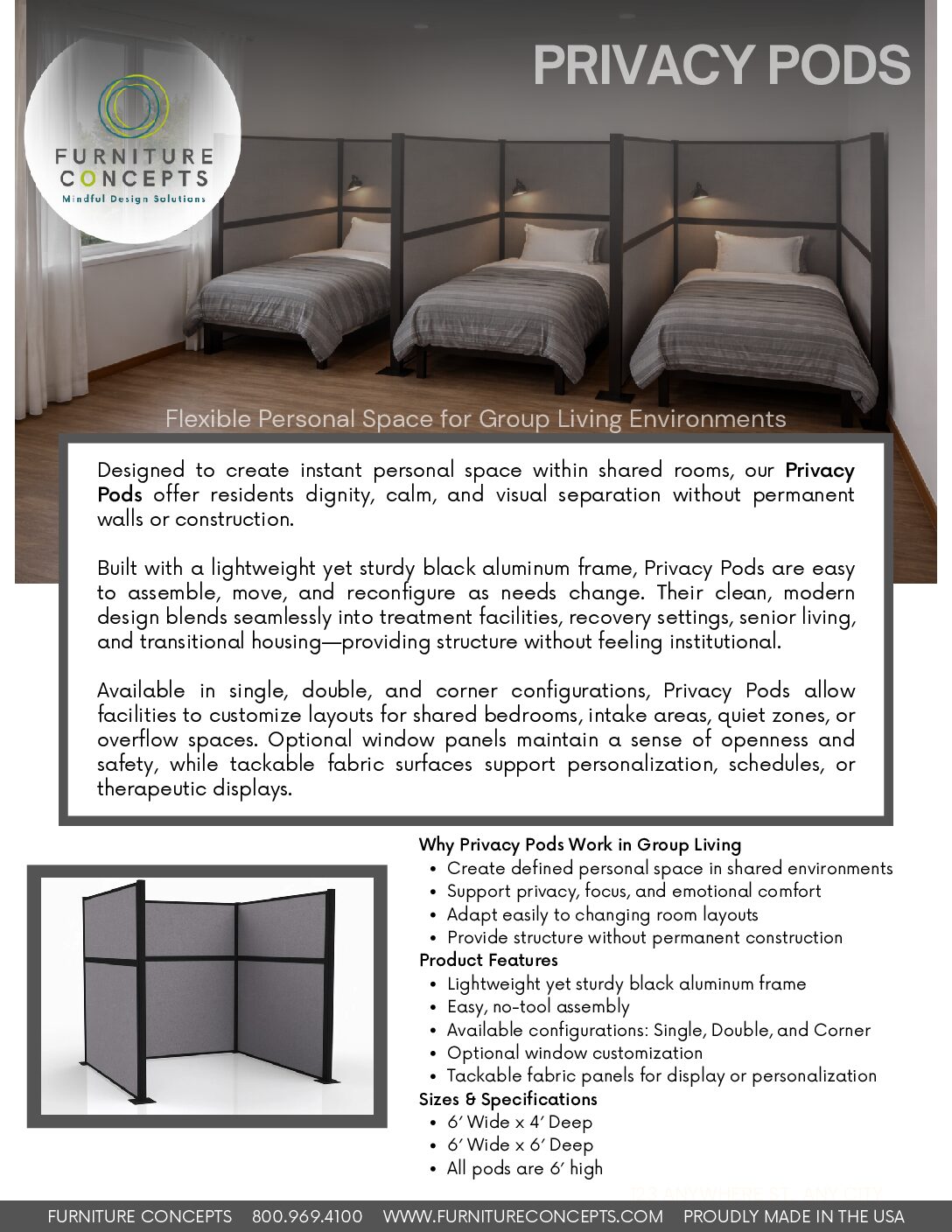 Privacy Pods create instant personal space in shared living environments, offering dignity, calm, and visual separation without permanent walls. Lightweight, modular, and easy to assemble, they provide a flexible privacy solution for behavioral healthcare, recovery, senior living, and transitional housing settings.
