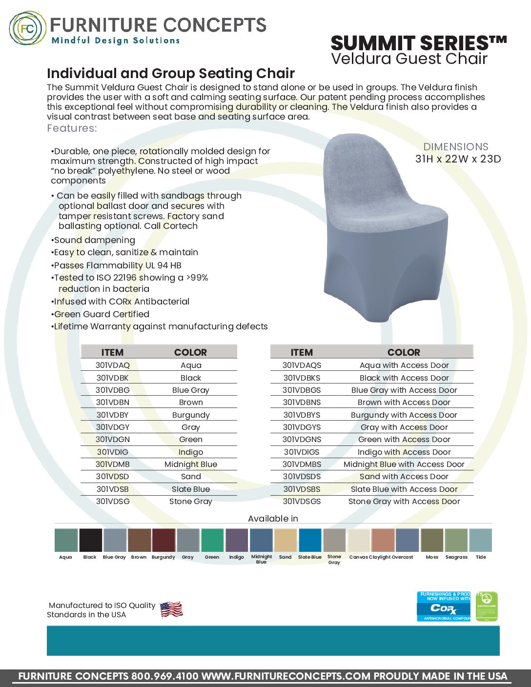 | Summit Molded Plastic Colors | AQUA, BLACK, BLUE GRAY, BROWN, BURGUNDY, CANVAS, CLAYLIGHT, GRAY, GREEN, INDIGO, MIDNIGHT BLUE, MOSS, OVERCAST, SAND, SEAGRASS, SLATE BLUE, STONE GRAY, TIDE |